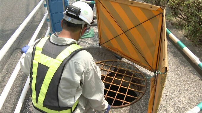 10日午後、北九州市小倉南区徳力では、雨水を流す地下の水路を調査するため作業員が中に入っていきました。