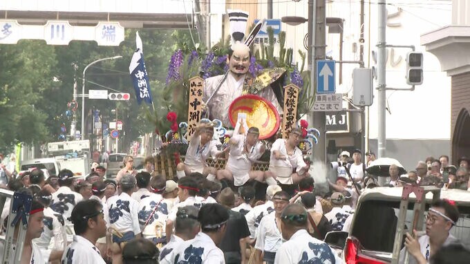 沿道には男たちの勇姿を一目見ようと多くの見物客が集まり、男たちには勢い水がかけられました。
