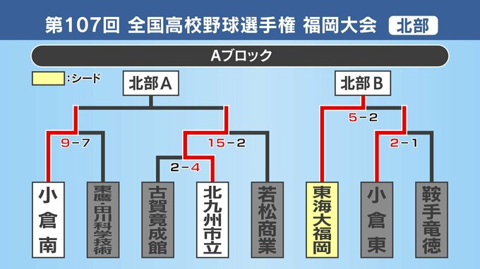 【めざせ甲子園!】夏の高校野球・福岡大会(北部)11日の結果 シード校の育徳館敗れる 東海大福岡・希望ヶ丘・折尾愛真・東筑・九国大付・ノーシードの小倉商業がベスト32進出 2025年7月11日(金) 19:57 国内 【北部Aブロック】シード校・東海大福岡がベスト32進出 東海大福岡5-2小倉東