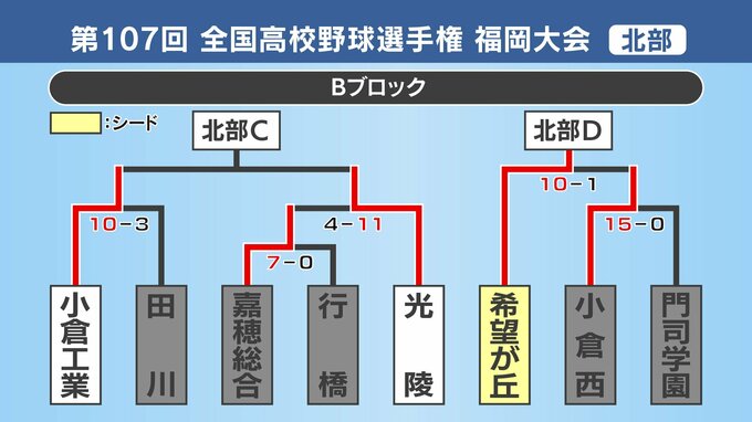 【めざせ甲子園!】夏の高校野球・福岡大会(北部)11日の結果 シード校の育徳館敗れる 東海大福岡・希望ヶ丘・折尾愛真・東筑・九国大付・ノーシードの小倉商業がベスト32進出 2025年7月11日(金) 19:57 国内 【北部Bブロック】シード校・希望が丘がベスト32進出 希望が丘10-1小倉西