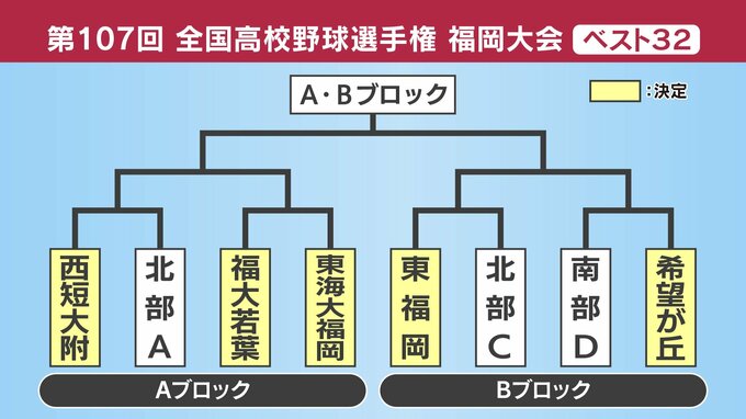 夏の高校野球 福岡大会トーナメント表(ベスト32~決勝) 11日は13校がベスト32進出決める 参加132ーム(134校)の頂点は 2025年7月11日(金) 19:54 国内 【ベスト32~準々決勝】ABブロック 西短大附・ノーシードの福大若葉・東海大福岡・東福岡・希望が丘がベスト32進出