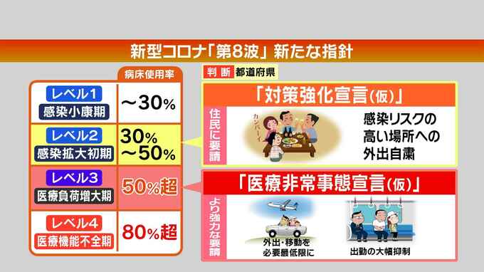 政府の新たな方針では、病床使用率が50%を超え感染拡大期に入った場合は、自治体の判断で「対策強化宣言」を出せるようになりました。さらに、感染拡大が続いた場合には「医療非常事態宣言」を出し、外出や移動を必要最低限にし、出勤を大幅に抑制するなどの呼びかけを行います。