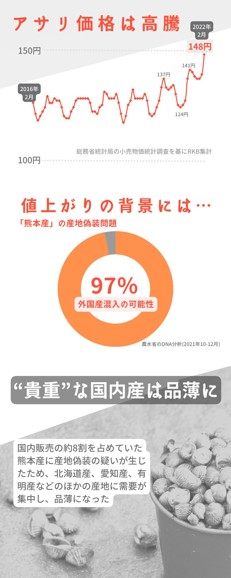 農水省のDNA調査によると、熊本産として販売されたアサリの97%に外国産が混入していた可能性がある。国はこの産地偽装問題を受けて、アサリの産地表示のルールを厳格化した。
