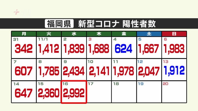 新型コロナ陽性(16日)福岡県2992人、佐賀県586人 2022年11月16日(水) 17:51 国内 新型コロナウイルスの感染状況です。福岡県では16日、新たに2992人の陽性が確認されました。前の週の同じ曜日を3日連続で上回っています。60代以上の男女6人が亡くなっています。15日時点で、病床…