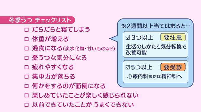 木村院長によると、うつの症状を訴える人が増えている背景には、新型コロナの影響で人との触れ合いが減ったり仕事が思い通りにできなかったりしたこともあるといいます。そのため、冬が本格化するこれからの時期と感染の第8波が重なることを懸念しています。