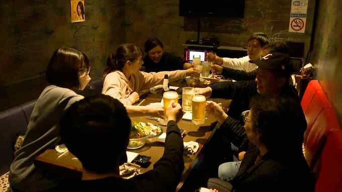 一方、小倉南区のカラオケ店では、土曜日の夜に4世代10人の家族がパーティーを開いていました。この店は、隣接する居酒屋と提携していて、カラオケを楽しみながら刺身や焼き鳥などの居酒屋メニューを味わうことができます。