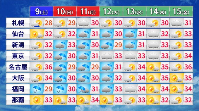 3連休明けの13日(水)頃からは再び夏の太平洋高気圧が勢力を強めるでしょう。