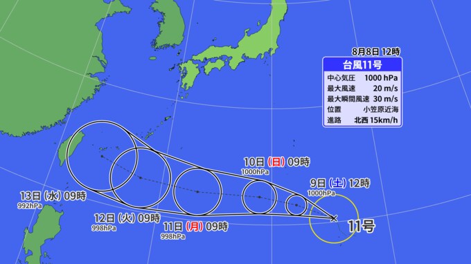 台風11号は来週初めにかけて西よりに進み、12日(火)~13日(水)頃に沖縄に接近する見込みです。