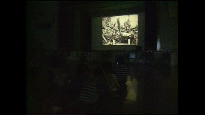 児童たちが、原爆直後の記録映画を見て戦争について学んでいました。
