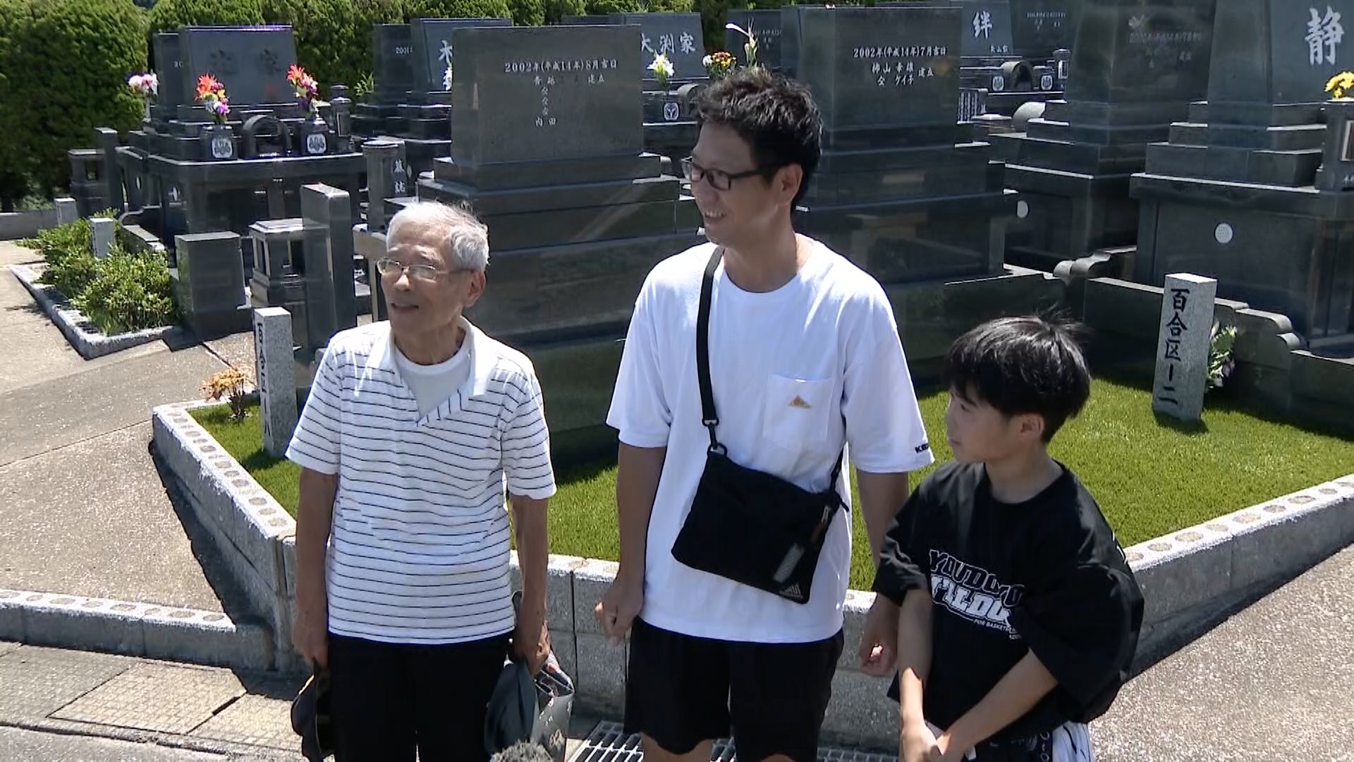 「糸島市二見ヶ浦の霊園です。この暑さの中、ご家族で墓参りに訪れています」