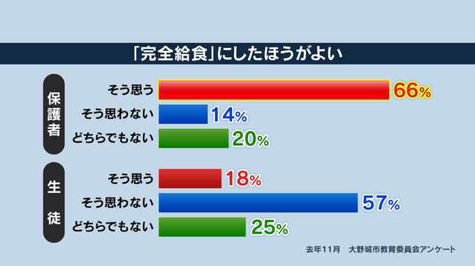 議長を除く19人のうち、請願に賛成した議員は1人だけでした。市の教育委員会によると、去年11月に実施したアンケートで、保護者の66%が「完全給食にした方が良い」と答えたのに対し、生徒は「そう思わない」が57%と、逆の結果になったといいます。