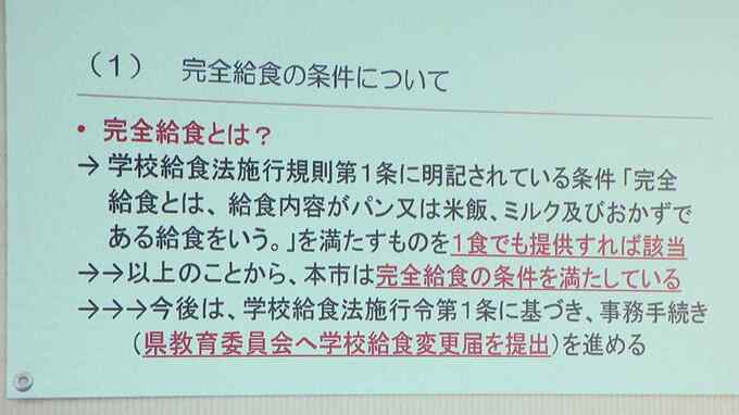 大野城市教育委員会 川口司寛係長「『給食内容がパンまたは米飯、ミルクおよびおかずである給食をいう』を満たすものを1食でも提供すれば該当。以上のことから、本市は完全給食の条件を満たしている」