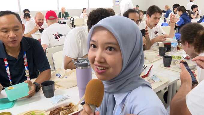 「とてもおいしいです。私たちはインドネシアからきました。私たちの国の食べ物はハラルです。従業員食堂は食べることが出来る料理を選びやすい」