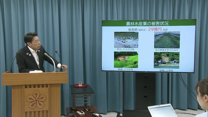 福岡県の服部知事は、8月の記録的な大雨で県内の農林水産業が受けた被害が29億円にのぼるとして、緊急支援を行うと発表しました。