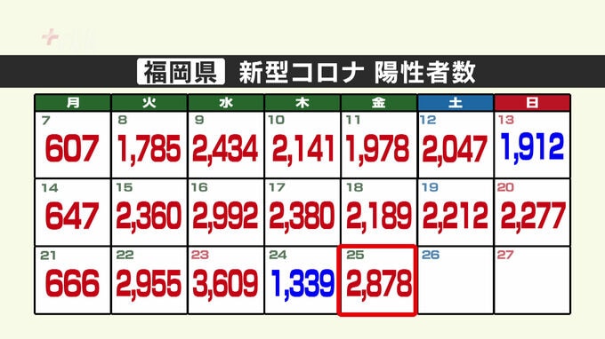 新型コロナの陽性確認 福岡2878人、佐賀県で865人 2022年11月25日(金) 17:47 国内 新型コロナウイルスの感染状況です。25日は福岡県で2878人、佐賀県で865人の陽性が確認されました。◆病床使用率は30%超す福岡県の1日ごとの陽性者数を示すカレンダーで、25日は2878人、前…