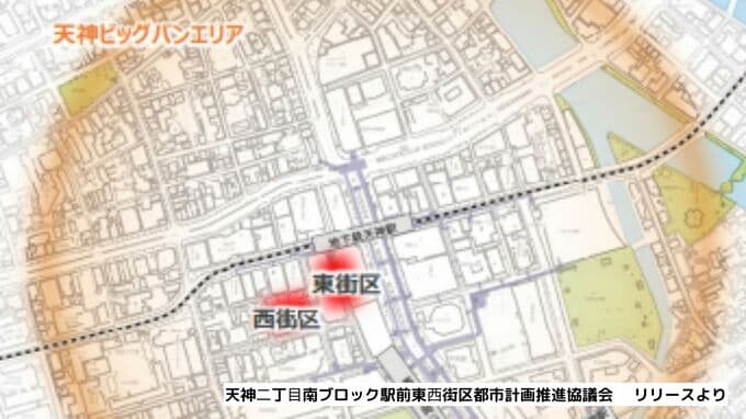 再開発されるのは、現在の福岡パルコと隣接する西日本鉄道(西鉄)の駅ビル、それに新天町商店街の周辺の約2万2000平方メートル。東街区には、福岡パルコ本館・新館、三井住友銀行、新天町ビル、西鉄福岡(天神)駅ビルが含まれる。西街区には新天町商店街がある。いずれも天神の中心に位置する。