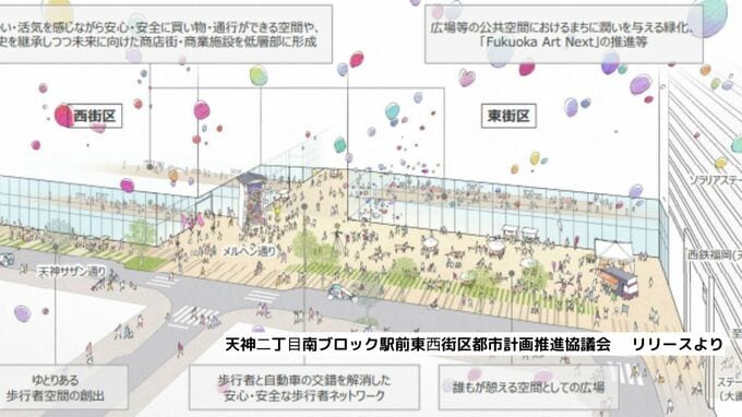 福岡市中心部にある福岡パルコや新天町商店街などを一体開発する計画案が30日、福岡市に提出された。一帯を「大きな街区」ととらえ、自由通路や広場を新設。立地をいかして文化・芸術が感じられる複合施設も新たに設ける。開業は8年後の2030年度を目指す。