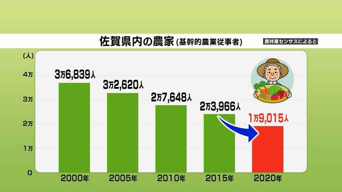さらに農家の担い手不足も深刻な状況です。佐賀県内で農業に従事する人の数は5年前と比べて約5000人減少。全体の6割を65歳以上の高齢者が占めています。