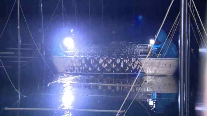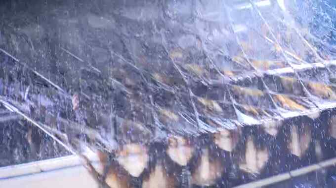 福岡県柳川市沖の有明海では、2日午前1時ごろから収穫が始まりました。気温が2℃を下回る厳しい冷え込みの中、小舟に積んだカッターをノリ網の下にくぐらせると、刈り取られた黒いノリが船の中にたまっていきます。