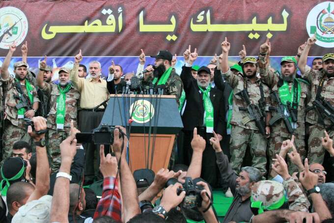 打倒イスラエルを掲げて集会を開くイスラム組織ハマス幹部ら=パレスチナ自治区ガザ地区で2013年11月14日、大治朋子さん撮影