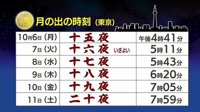 例えば、東京の月の出の時刻は「中秋の名月」(十五夜)だった10月6日は午後4時41分ですが、翌日の「十六夜(いざよい)」では午後5時11分と、ちょうど30分も遅くなります。