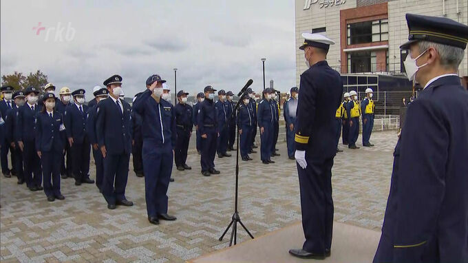 午前10時から開かれた出陣式には、門司税関と門司海上保安部、福岡県警から約80人が参加しました。門司海上保安部長の訓示の後、パトカーや巡視船などが一斉にパトロールへ出動しました。