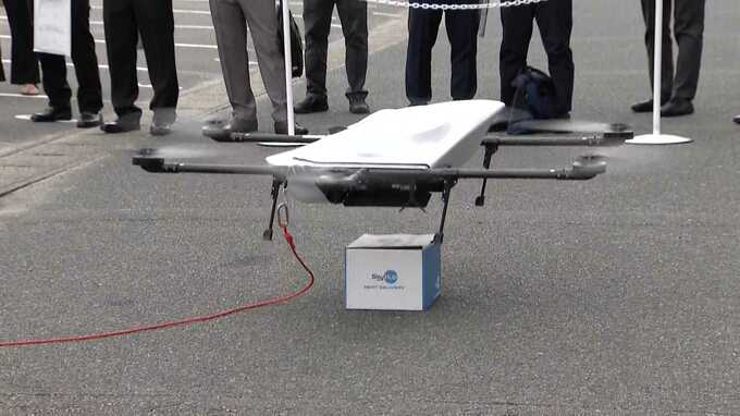こちらは宅配を想定した物流専用のドローン。5キロの段ボールを運ぶ実演飛行が披露されました。