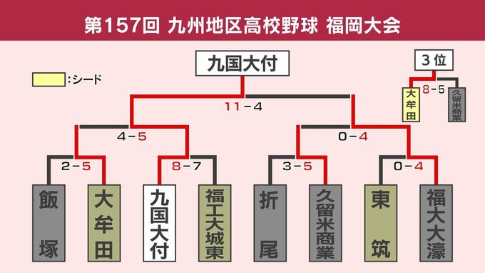 【26年センバツへの道】秋の九州地区高校野球 福岡大会(1回戦~決勝)勝ち上がり 九国大付と福大大濠が九州大会進出決める 2025年10月14日(火) 12:23 国内 【ベスト8~決勝】優勝・九国大付と準優勝・福大大濠が九州大会進出 決勝 九国大付11-4福大大濠 準決勝 九国大付5-4大牟田 福大大濠4-0久留米商業 準々決勝 大牟田5-2飯塚 九国大付8-7福工大城東 久留米商業5-3折尾 福大大濠4-0東筑