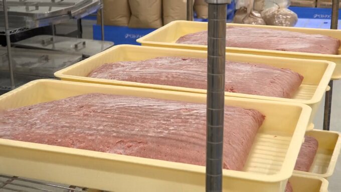 「原料となっているのは華味鳥の生肉です。この生肉を原料を混ぜる機械に入れていきます」
