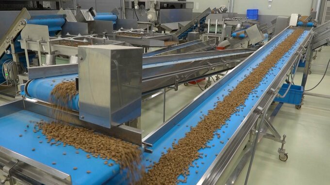 生肉に穀物や鰹節を混ぜ合わせ、細かく粉砕したあと、専用の機械で成形。乾燥、選別、検査を経て、ようやく完成します。