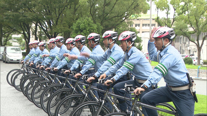 16日午後、福岡県警本部で行われた出発式には、福岡市内4つの警察署で編成する「自転車安全対策部隊」の警察官13人が参加しました。