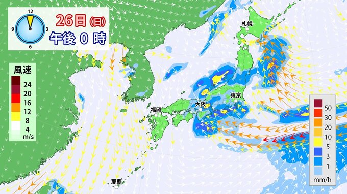 26日は、近畿から北海道にかけての広い範囲で雨が降るでしょう。局地的に雨量が多くなり、静岡県や神奈川県、千葉県では警報級の大雨となるおそれがあります。