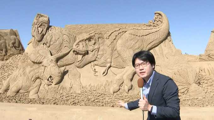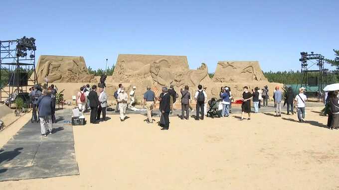 砂と水だけで作られた巨大な彫刻が並ぶ砂像展が、福岡県芦屋町で開かれています。