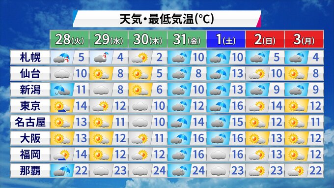 また、晴れる太平洋側を中心に朝は冷え込みが強まります。