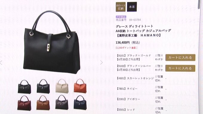 『ディライトトートは注文が集中しており、半年分の工場の生産量を現在ご注文頂いている状況です。その結果、現在4月末の出荷予定となっております。お問い合わせその他対応に、少しお時間を頂く事をお詫び申し上げます』