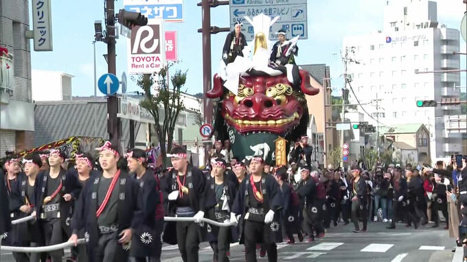 2日目の3日は「御旅所神幸」が行われ、獅子や兜をかたどった14台の豪華絢爛な曳山が唐津神社を出発し、西の浜にある「御旅所」に向かいました。