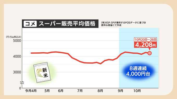 低コストでコメを増産 ”長すぎる夏”を逆手に取った「再生二期作」九州中心に導入進む 同じ水田で例年の1.4倍を収穫 2025年11月3日(月) 18:07 国内 暮らし・マネー 価格の高止まり続く 8週続けて4000円台 「令和の米騒動」から1年あまり。 新米が出回ったあとも依然として価格の高止まりが続いています。 10月末に発表された全国のスーパーでのコメの平均価格は5キロ4208円。 8週続けて4000円台を記録しました。