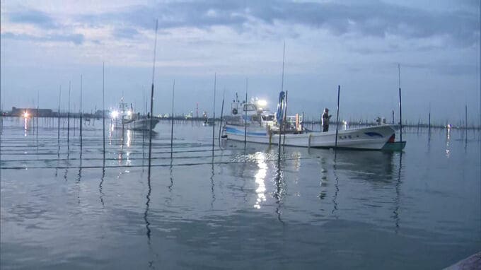 4日午前5時半頃、ノリの生産者が柳川市沖の有明海でカキの殻がついた網を海に広げました。