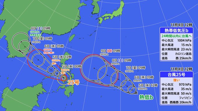 台風25号は、今後も発達しながら西よりに進み、南シナ海で非常に強い勢力となるでしょう。その後は、ベトナム方面に上陸して、熱帯低気圧に変わる見込みです。