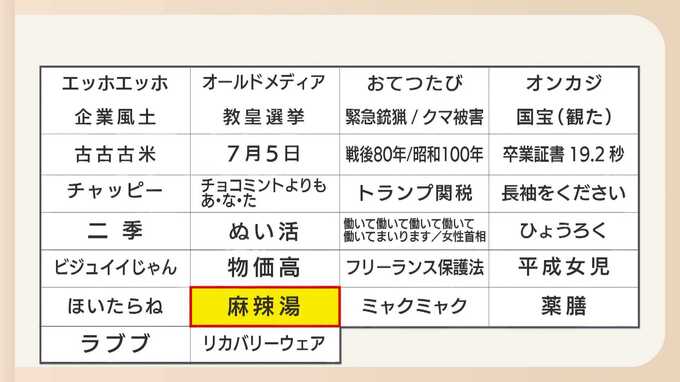 『古古古米』の販売会に行列 『国宝』博多座の歌舞伎チケットは初日に完売・・・「新語・流行語大賞」ノミネート30語発表 福岡では 2025年11月6日(木) 11:55 国内 話題・グルメ 専門店が続々出店 グルメからノミネートされたのが・・・ 中国四川省発祥の『麻辣湯』しびれる辛さが特徴で、具材や辛さなどを自分好みにカスタマイズできることも人気のひとつ。 特にZ世代を中心に大流行。 福岡市内では専門店の出店が今でも続いています。