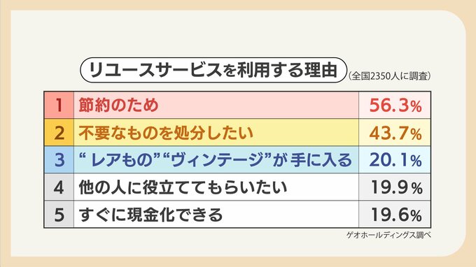 ゲオホールディングスが全国2350人に調査をしたものですが、1位は「節約のため」半数を超えています。
