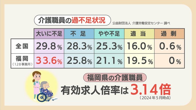 介護労働安定センターが介護職員の過不足状況について調べたところ、福岡県では昨年度、33.6%の事業所が「大いに不足」と回答しています。