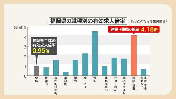 厚生労働省のまとめによりますと、県内の全業種の有効求人倍率は0.95倍に対し、建設業の有効求人倍率は4.18倍。