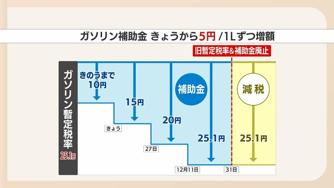 しかし、13日の時点では、補助金が10円の時に仕入れたものがタンクに残っているため、在庫が無くなるまでは補助金が15円に増額されたガソリンを仕入れることが出来ず、値下げすることも出来ないというわけです。