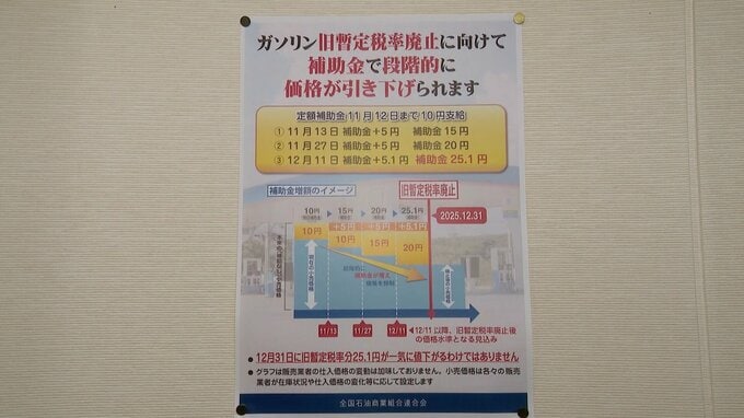 「スパンが今回、2週間、2週間、最後が20日ですから、我々としては、4週間ほど地下タンクの在庫があるところもあるので、場合によっては12月の31日に暫定税率が消えてですね、1月1日にも高い在庫を抱えたところがあるということになりますので、決してぽんと下げられないという事情をご了解いただきい」