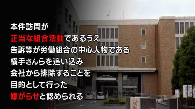 「本件訪問が正当な組合活動であるうえ告訴等が労働組合の中心人物である横手さんらを追い込み、会社から排除することを目的として行った嫌がらせと認められる」
