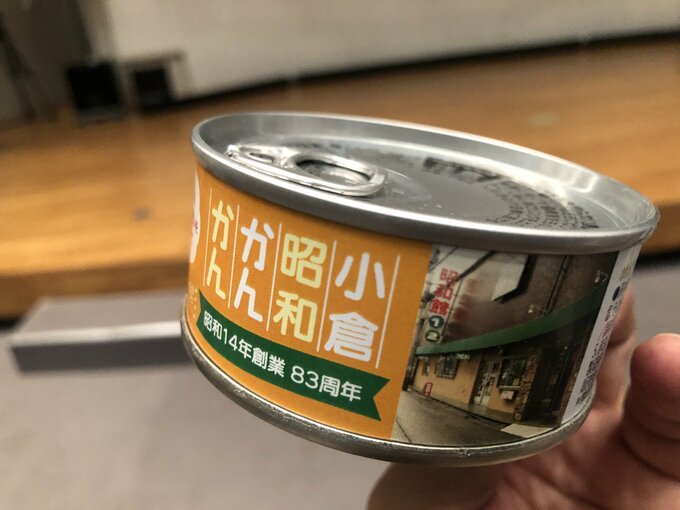 樋口智巳館主:ポップコーンは、チーズとキャラメル2つの味が一緒に入っていて、とてもおいしいです。それから今回、火災後作ってくださった「小倉昭和かんかん」。私の思いを詰めています、缶だけに。ツナとめんたいの缶、500円です。在りし日の……在りし日と言うのが痛いけど、昭和館の外観とネオンがラベルに映っています。よろしければ、お声かけください!