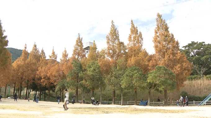 「こちらではメタセコイアが見ごろです。このきれいな黄金色は、あと1週間ほど楽しめるということです。」