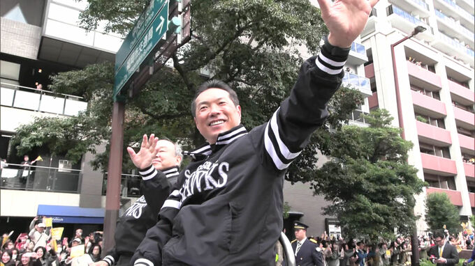 2年連続のリーグ優勝、そして5年ぶりの日本一を祝うパレードで、先頭の車両には、小久保監督と選手会長の周東選手、孫オーナーが乗車。