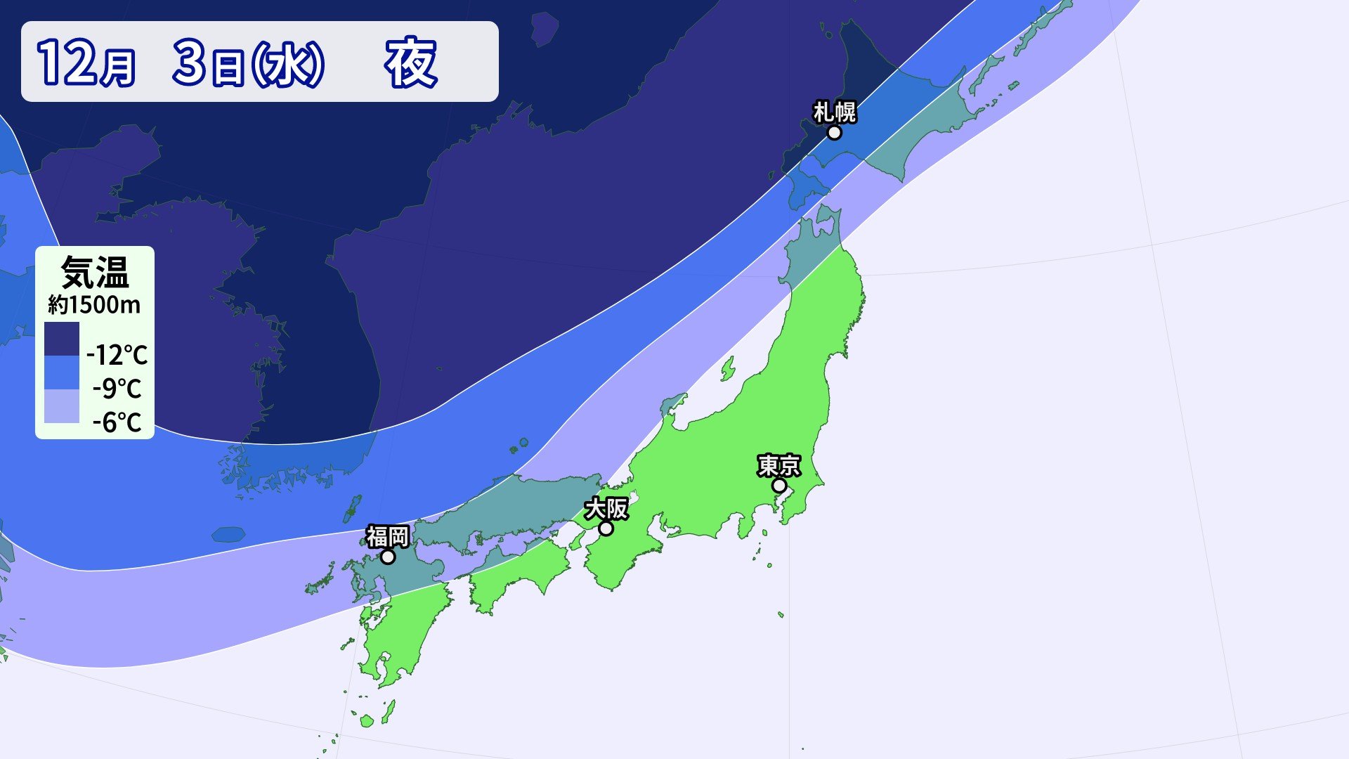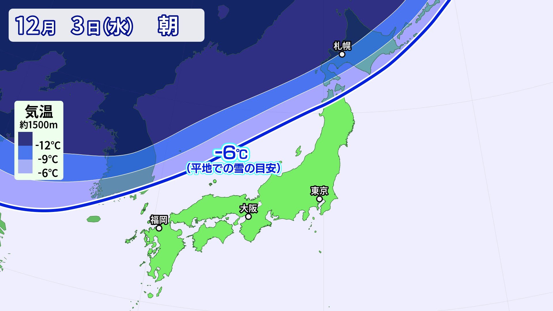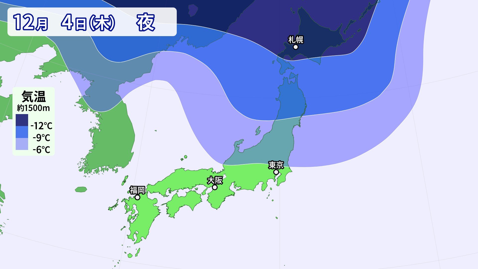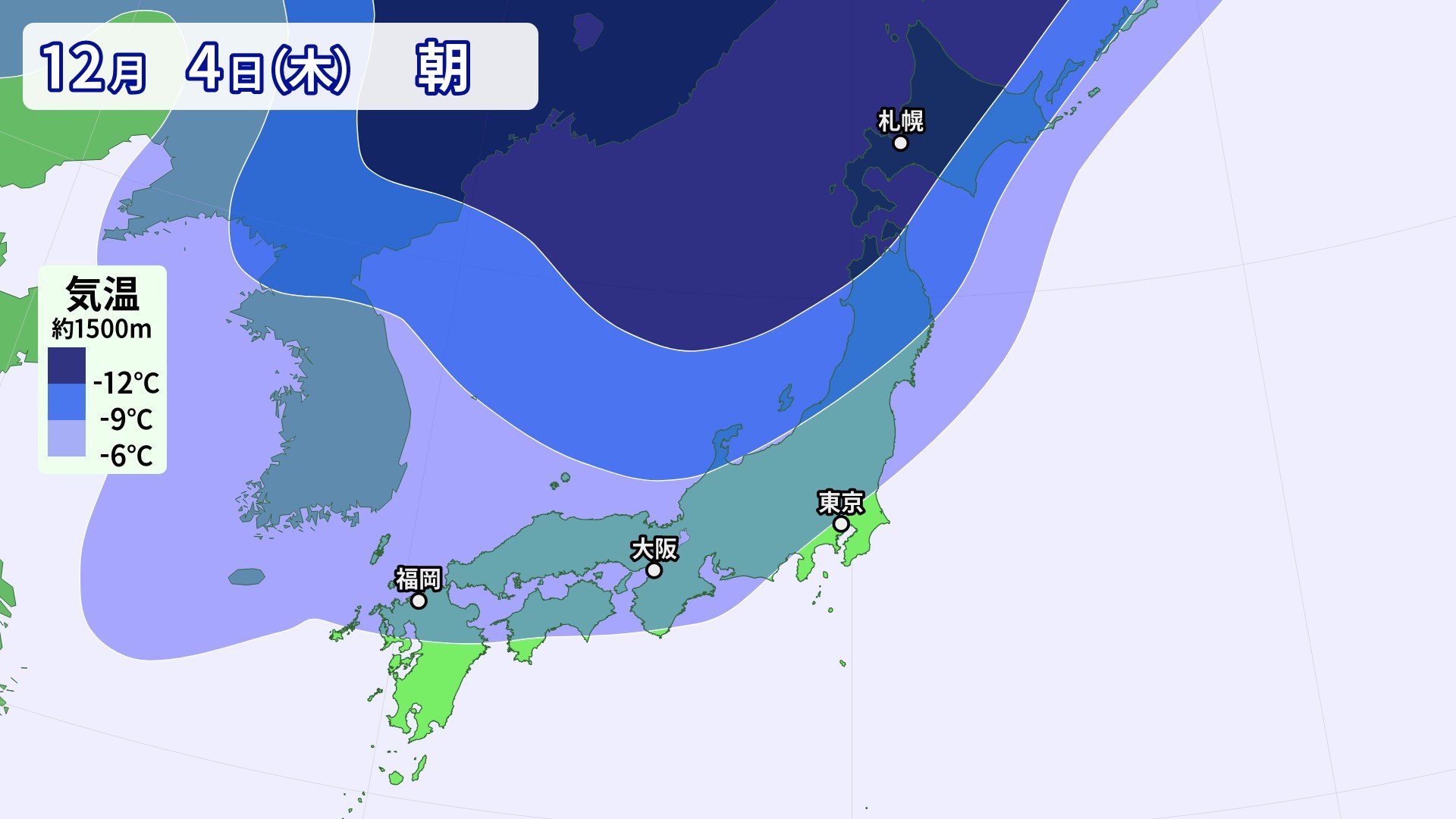 4日朝には、上空約1500メートルでマイナス6℃以下(平地で雪が降る目安)の強い寒気が日本列島をすっぽりと覆い、西日本でも初雪となる見込みです。